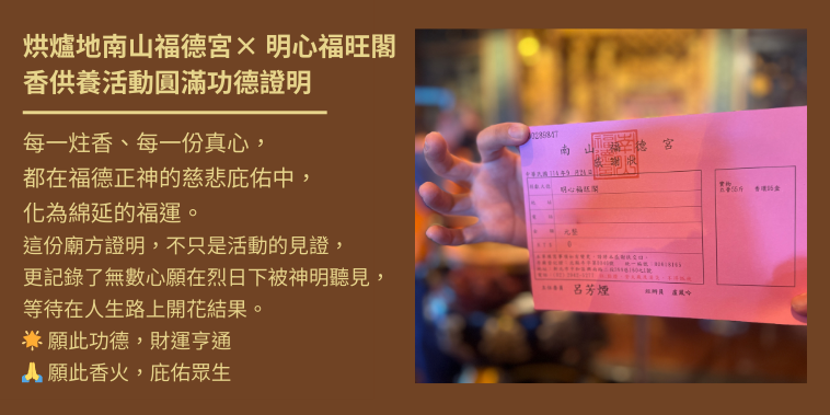 活動圓滿結束後,我們獲得了烘爐地南山福德宮提供的感謝狀,這不只是對我們香供養活動的認可,更是福德正神對眾信虔誠心意的見證。