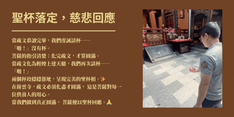 菩薩的指引很清楚:化完疏文,才算圓滿。當疏文化為輕煙,承載著所有心願上達天聽,我們再次恭敬請杯——