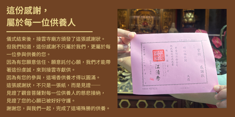 這不只是對我們的肯定,更是對每一位參與供養的善信的感謝——因為有您的虔誠參與,才讓這場香供養得以圓滿。