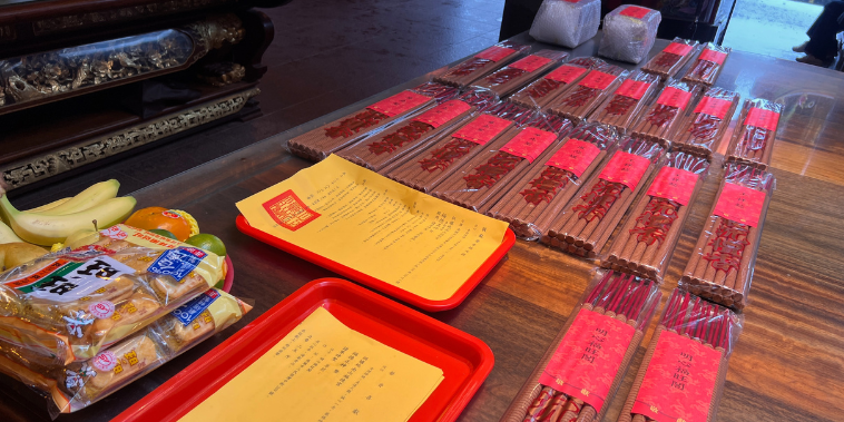 將所有參與者的香品一一貼上名條,恭敬地放在供桌上,並點香虔誠稟告伯公。