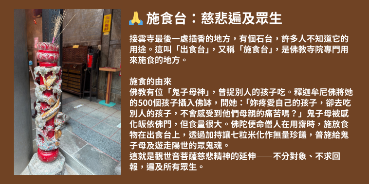 這也是為什麼,當我們在接雲寺供養時,不只在大殿上香,也會在出食台上香。