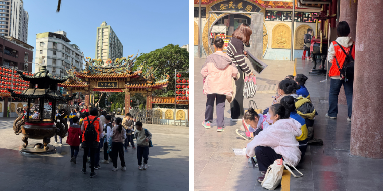 有的孩子拿著筆記本抄寫,有的孩子睜大眼睛看著殿內的神像,還有孩子好奇地東張西望。
