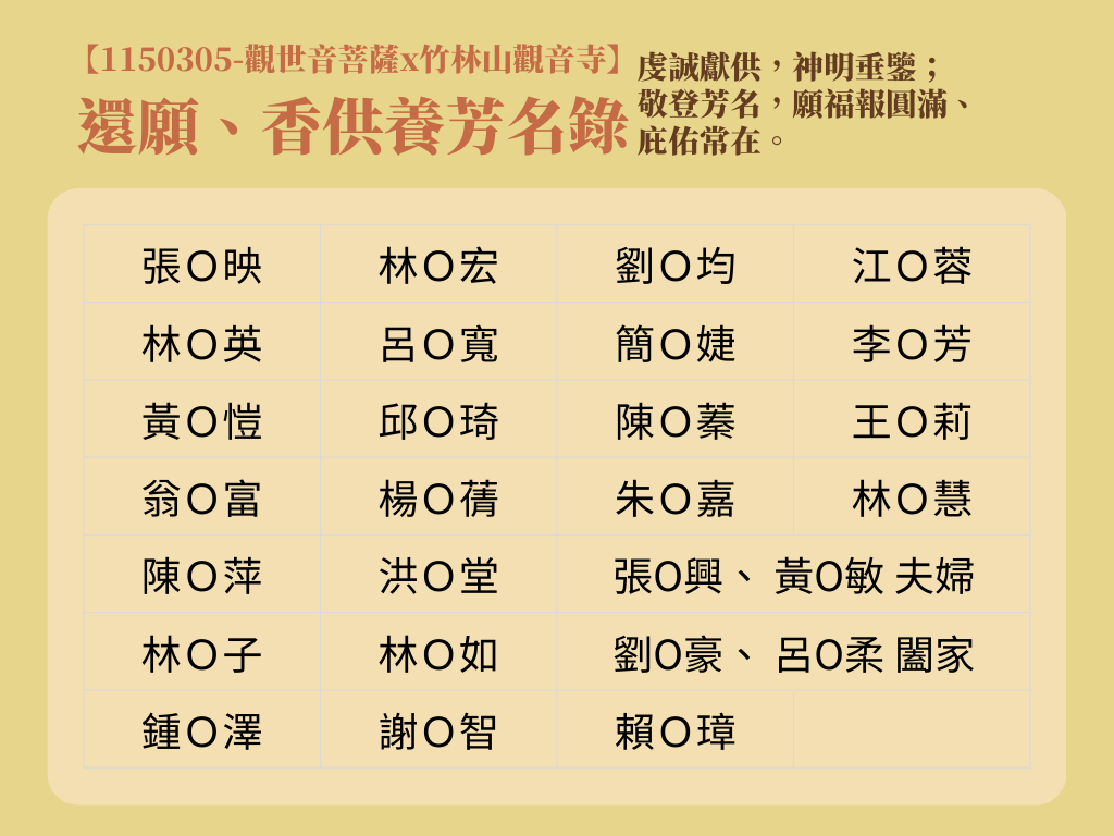 您的名字已在觀音菩薩聖前被誦讀,您的心意已隨著香煙上達菩薩聖前。
