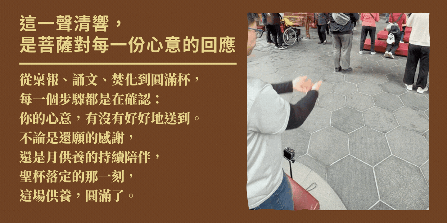- 🔸 擲杯確認焚化時機,獲得聖杯 疏文唸完後擲杯,確認何時可以焚化。每位神明都非常認真看待每一次供養,每次都需要一定的時間才能前往焚化文疏。聖杯。✨