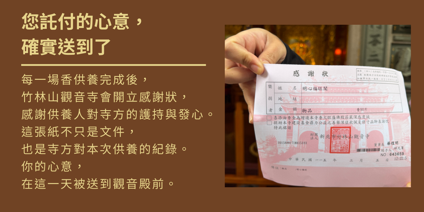 在這場與觀世音菩薩的對話中,您們每一位都是不可缺少的聲音。感謝您們讓這次還願香供養得以圓滿,讓每一炷香都承載著最真摯的感恩。
