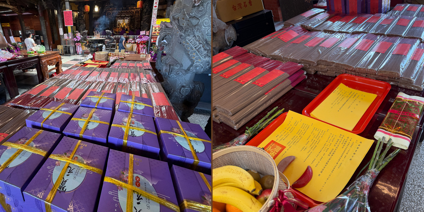接著開始清點。每一份香品上都貼著供養人的名條,一份一份和疏文對照。名字對了,數量對了,才開始拍攝紀錄照。