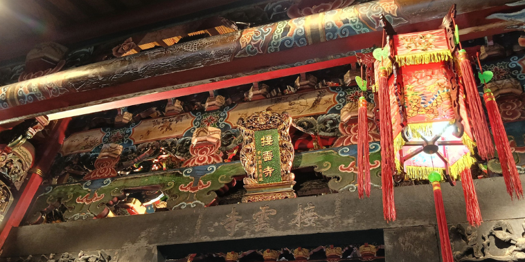 藻井的建造極為精細,斗拱的排列組合錯落有致,層層向上收縮。這種精湛的木工技藝,展現了傳統匠師的虔誠與用心——他們不只是在建一座廟,而是在為觀音菩薩建造人間的道場。