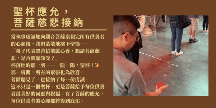 我們向觀音菩薩擲筊請示:「弟子代表眾善信敬獻心香,懇請菩薩慈悲,是否圓滿領受?」