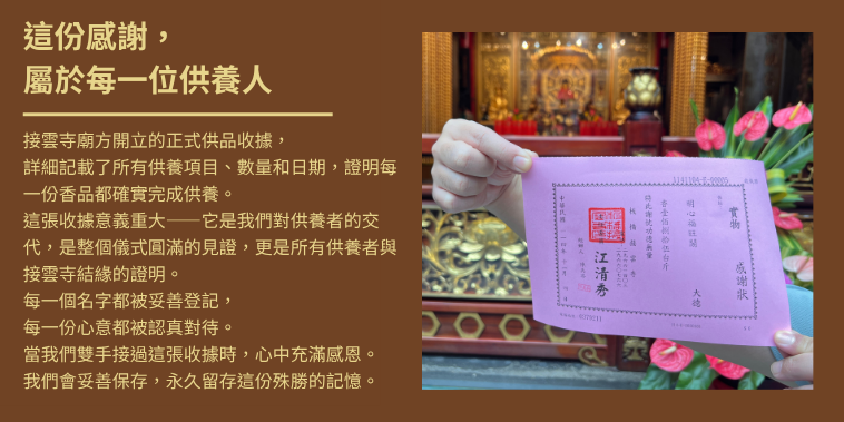 這是接雲寺廟方開立的供品收據,證明我們確實完成了所有供養者的委託。