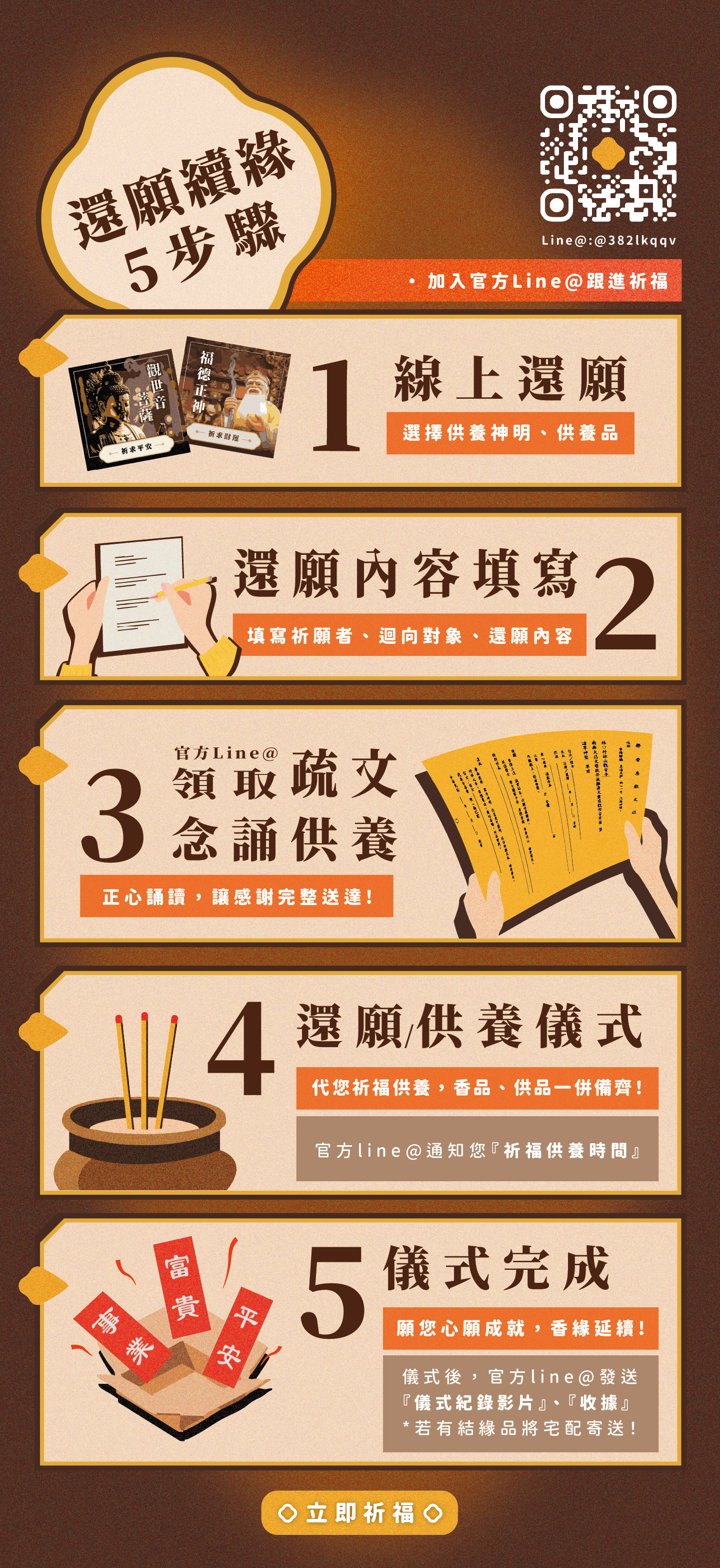A:還願最重要的是「心」,我們協助您完整呈遞誠心,神明自會感應。